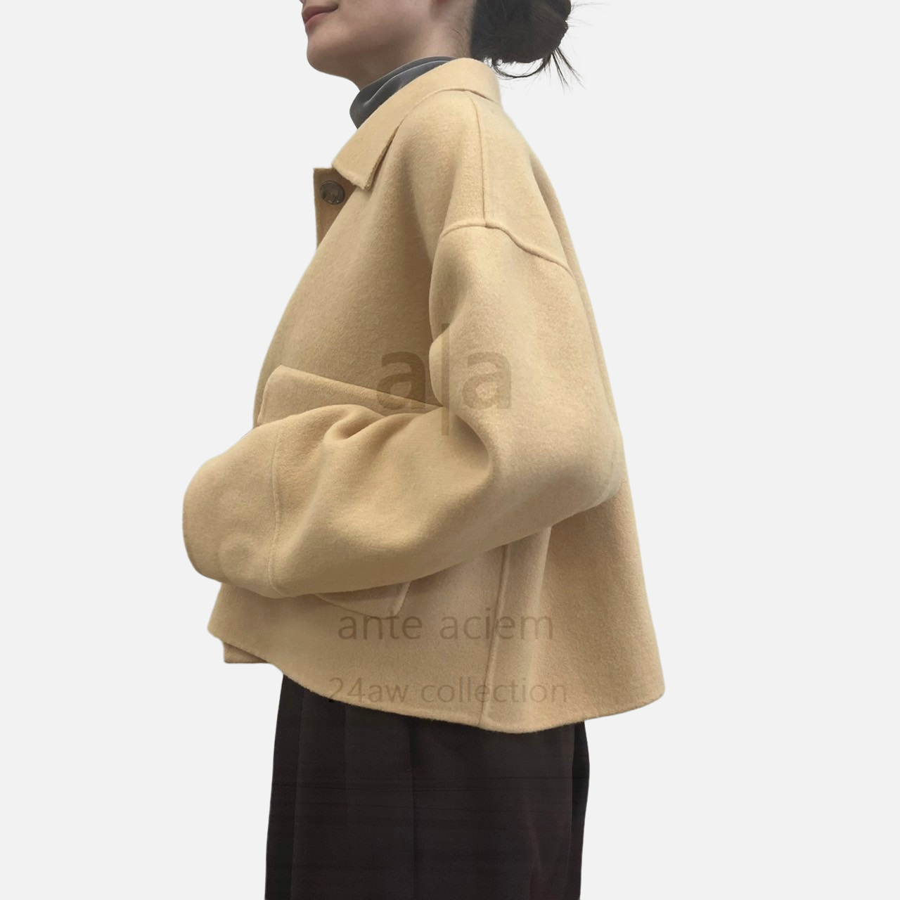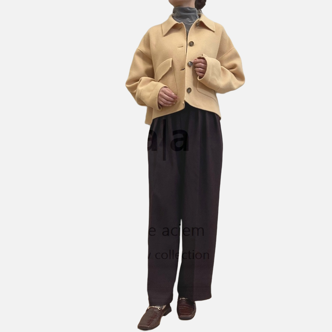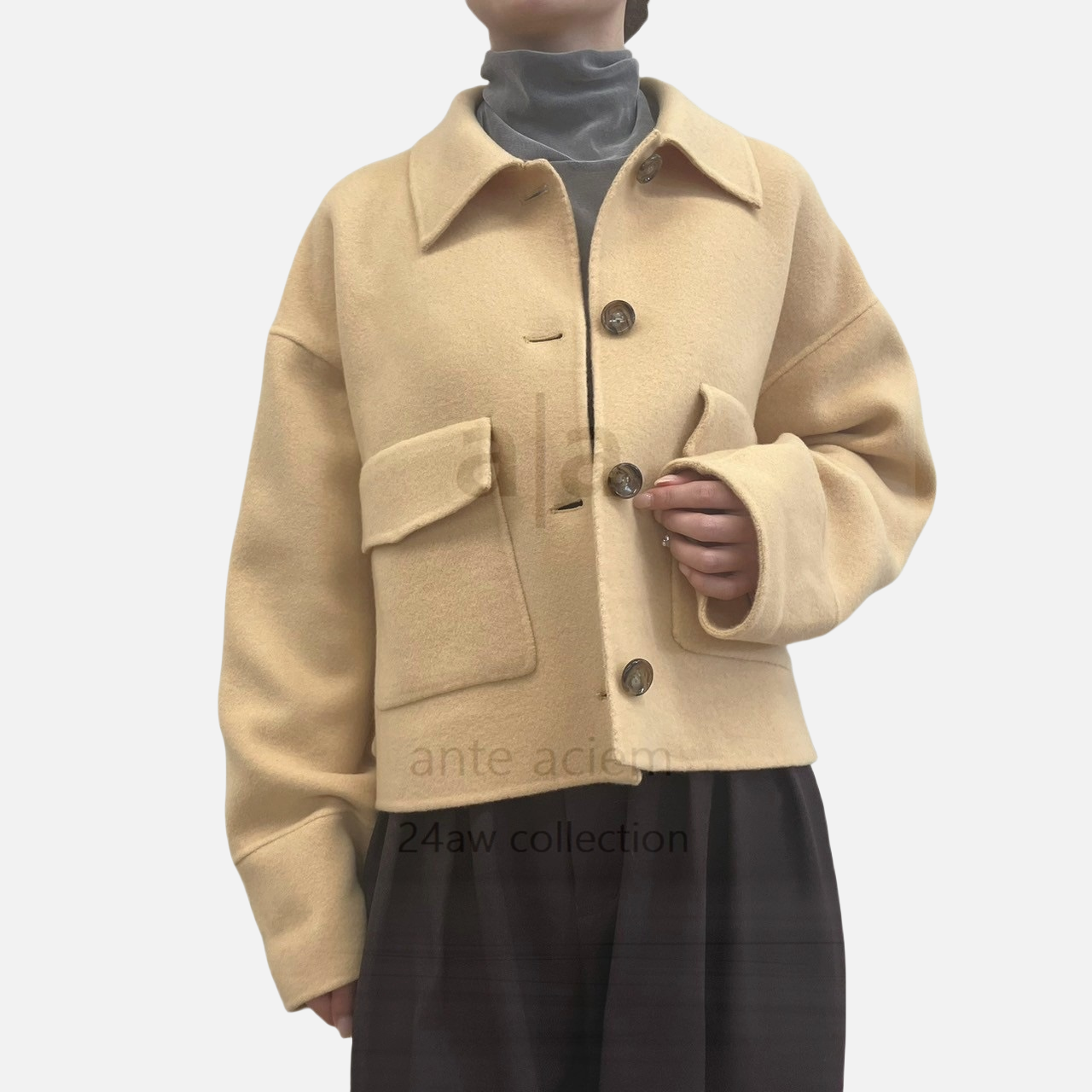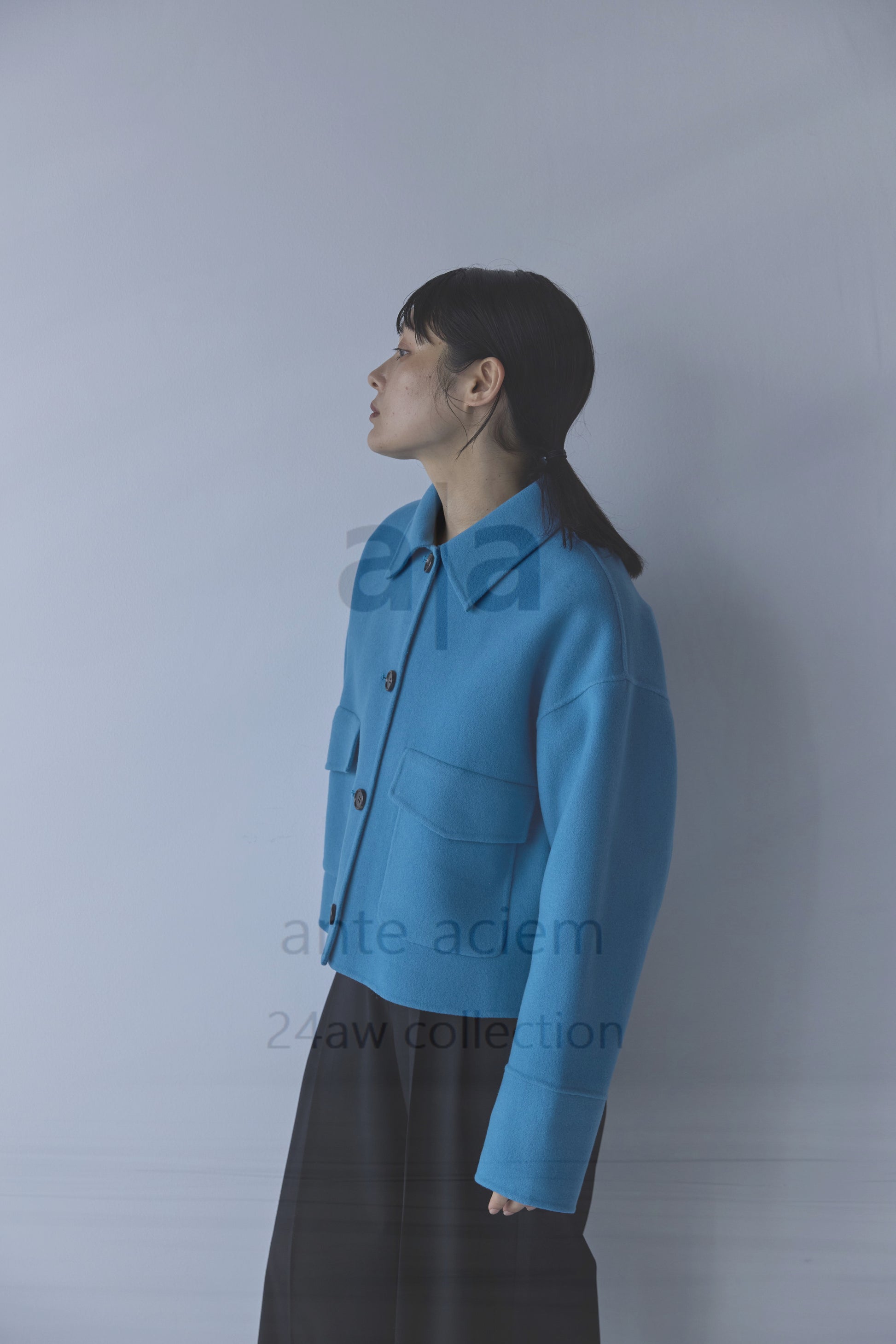 Fabric: Jackal Double-Woven Pile Melton. This outerwear material is made from carefully selected Super 140s wool. It is finished to be lightweight and has a soft texture.