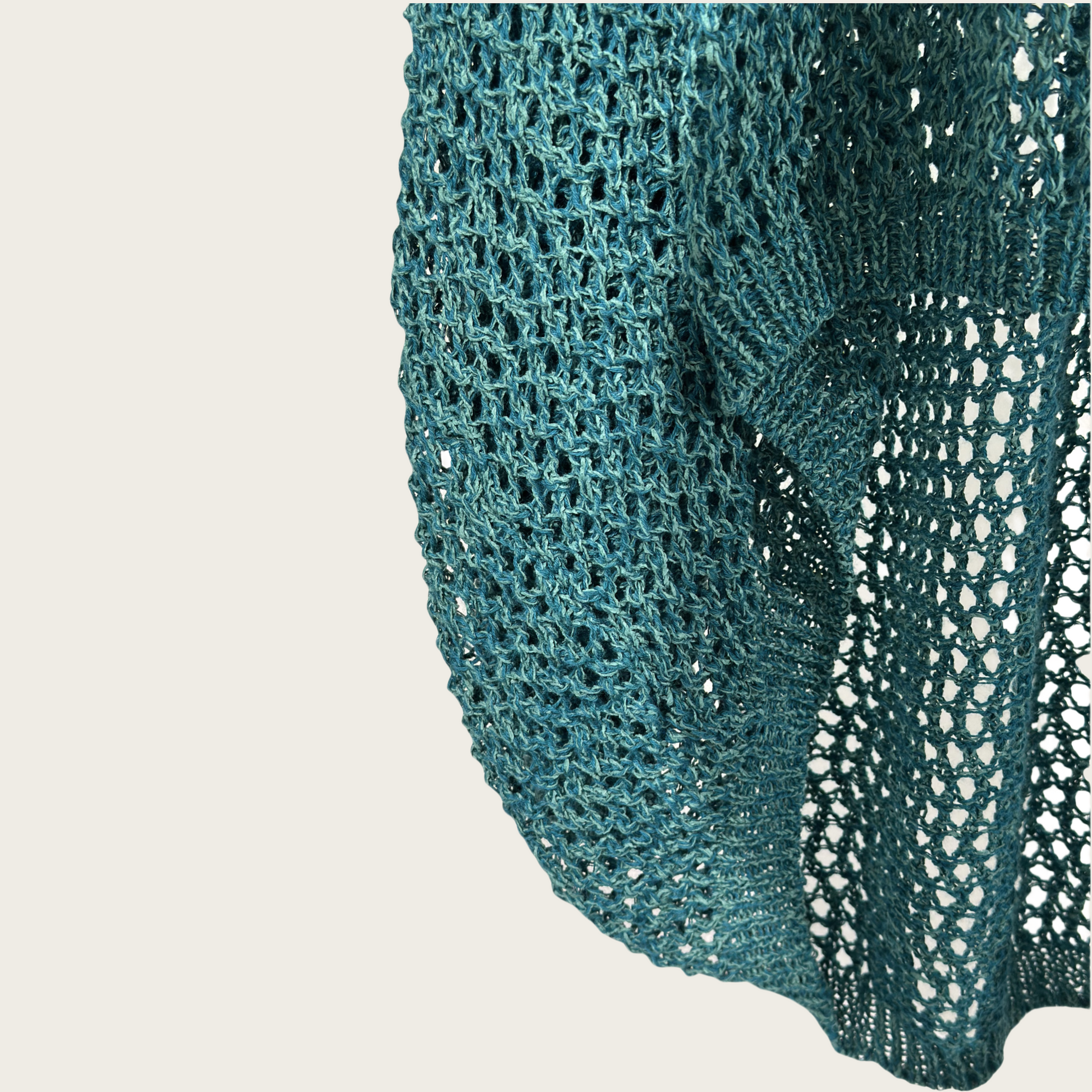 Yarn made in Japan. TUMUGI yarn is created by cutting washi paper into extremely fine strips and blending it with cotton and polyester. During the manufacturing process, a wall texture technique is applied, creating a textured, bumpy surface that gives a cool feeling. The finished product has the following characteristics: breathability, quick-drying moisture absorption, and lightness. It is also easy to care for, being suitable for home washing.